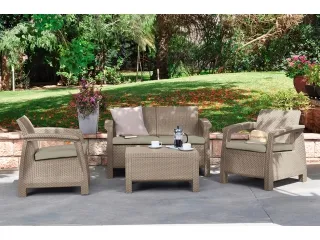 Элегантный комплект мебели с подушками. Изготовлен из полипропилена - прочного пластика.