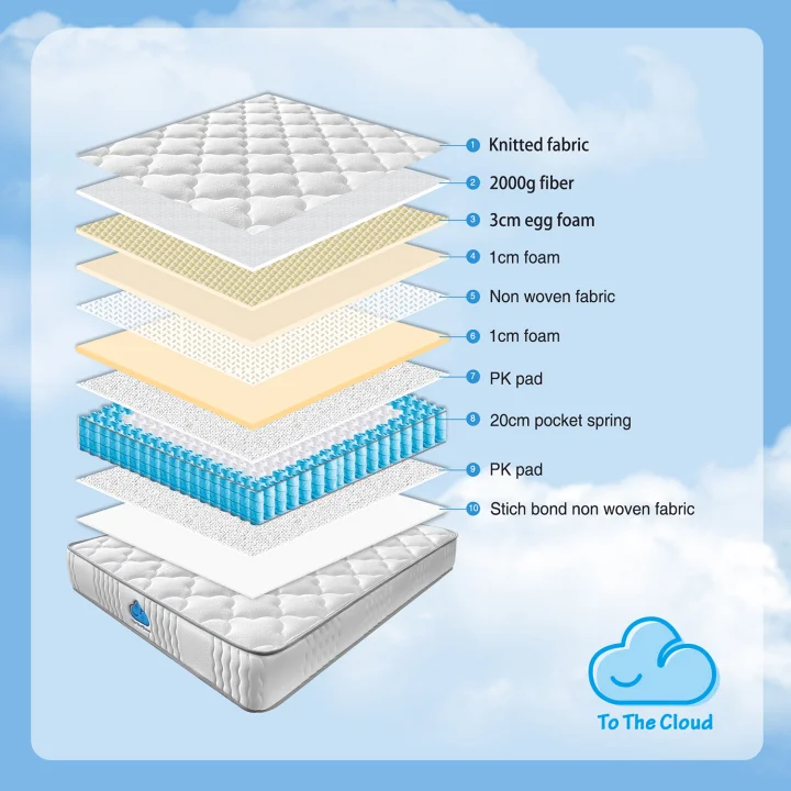 • Pocket vedrustus: 20 cm kõrgused, 2,0 mm ja 2,3 mm läbimõõduga eraldi taskutes vedrud